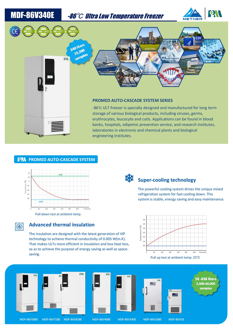 With the fastest door opening recovery (DOR) in the industry, PROMED ULT freezers ensure that your samples spend more time at optimal storage temperature ,even in the most challenging lab environments. An intuitive user interface and easy to read information center at eye-level deliver accurate temperature monitoring data in the lab, while Device Link enables remote monitoring anywhere in the world. An integrated USB port offers more convenient data download for tracking and analysis.